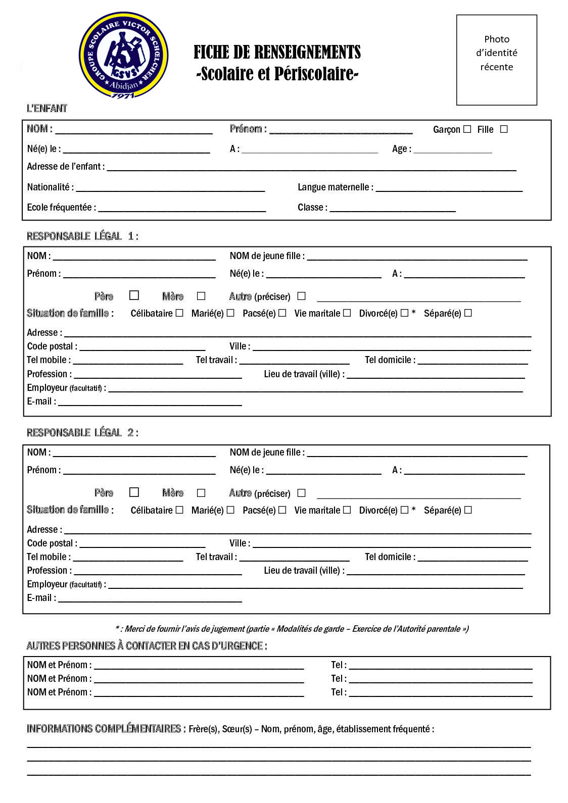 fiche-renseignement Home / fiche-renseignement Les Fiches de renseignements (Par Niveau d'Étude) 1ier Cycle: 6ième - 3ième Télécharger document PDF: 2nd Cycle: 2nd - Tle Télécharger document PDF: Comment Nous Contacter ? Le Secrétariat Envoyez-nous un message NOM & PRENOM: ADRESSE EMAIL: MESSAGE: Envoi Message Collège Victor Schoelcher Adjamé 220 logement Carrefour liberté Station TexacoAbidjan – Côte d’Ivoire Contacts & adresses Localisation Adjamé Liberté +225 2720376498 +225 0757556672 info@collegevictorschoelcheradjame.net Réseaux Sociaux +225 0757556672 collegesvictorchoelcheradjame College Victor Vchoelcher TV collegesvictorchoelcheradjame